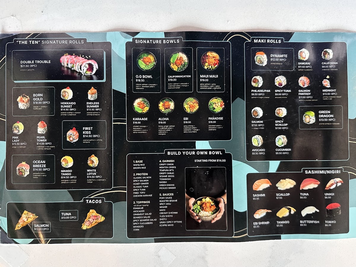 - The Ten Signature Rolls Top10 招牌卷: A set of ten distinctive sushi rolls with various ingredients, each served as an 8-piece roll. Examples include Double Trouble Roll, Hokkaido Sunset Roll, and Mango Tango Roll.