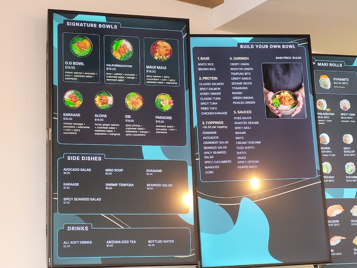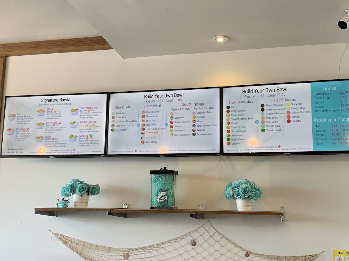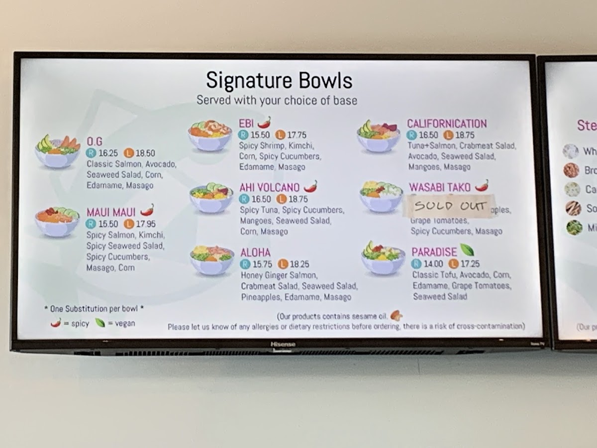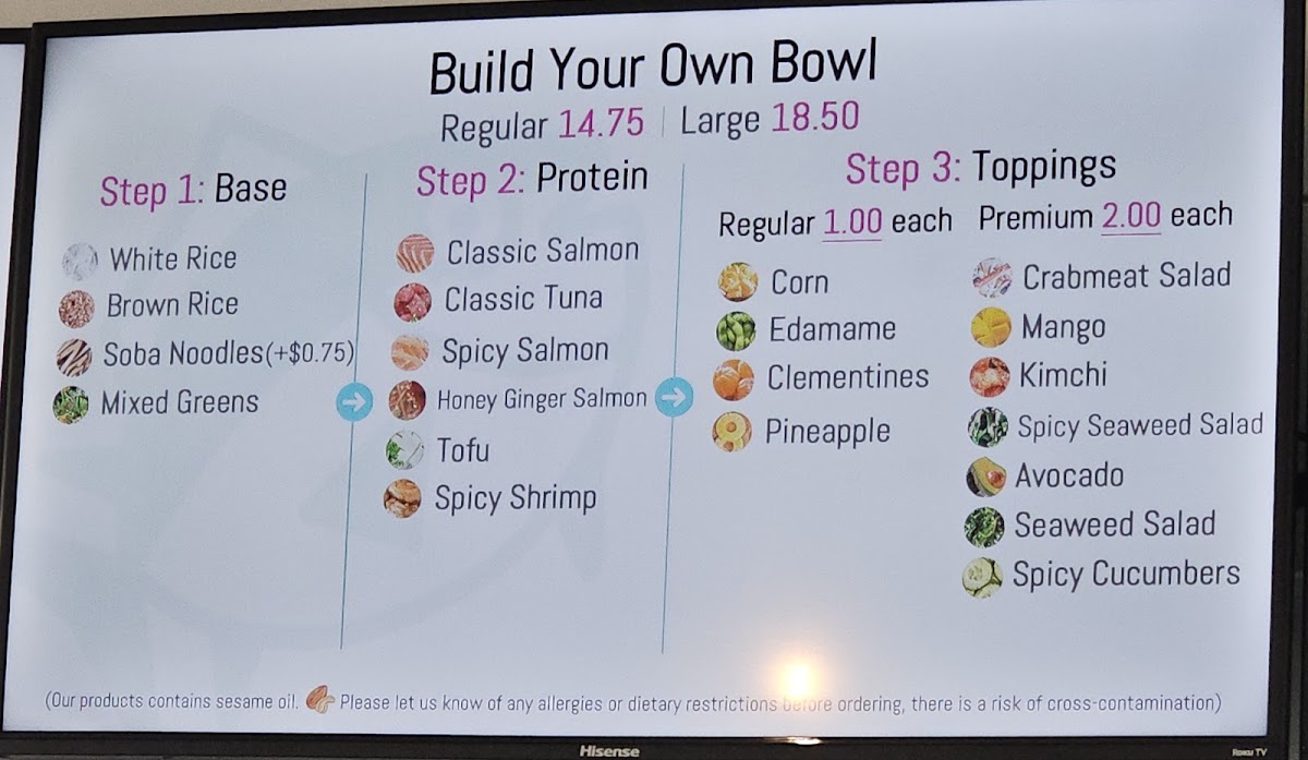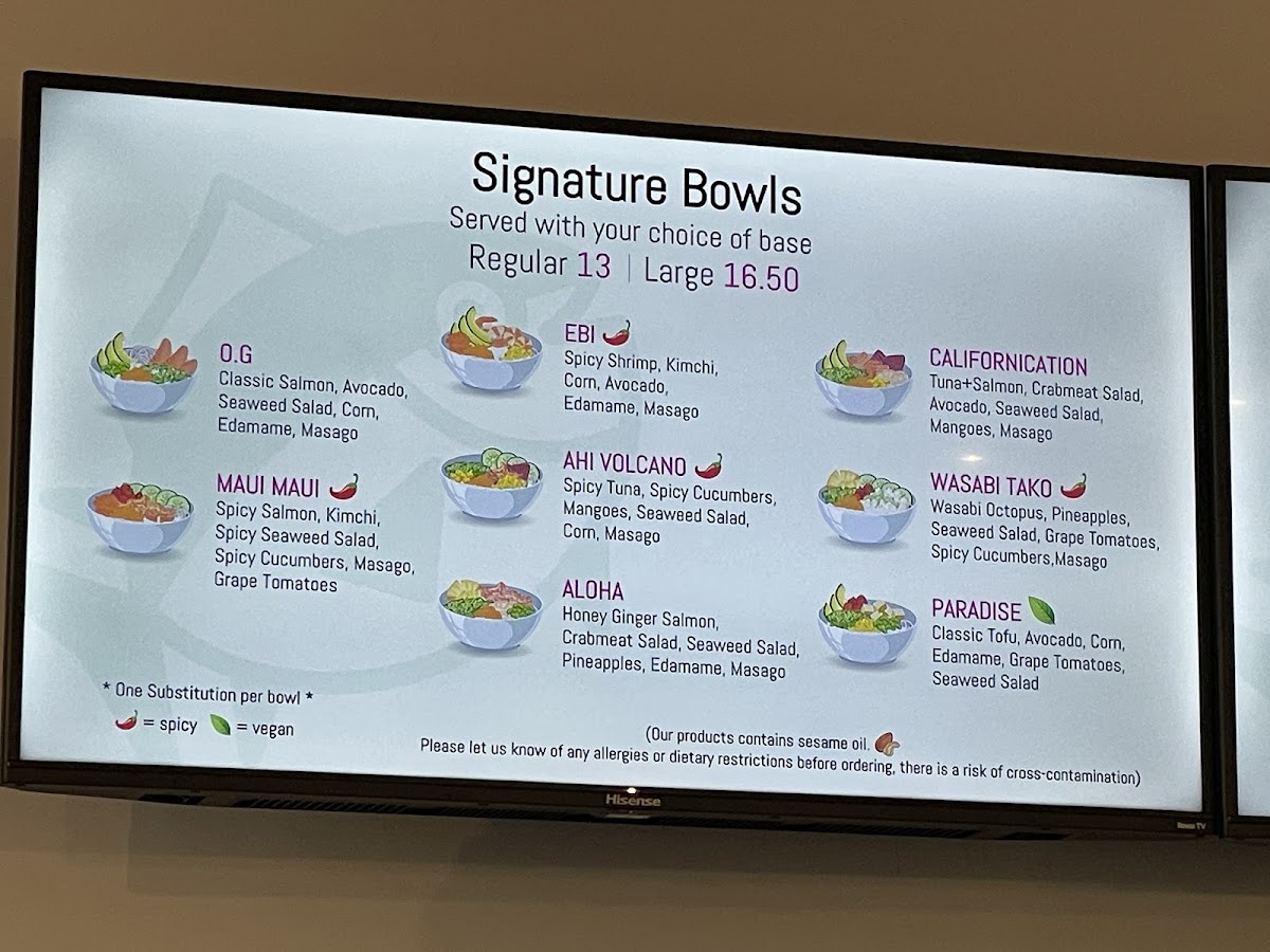- Signature Bowls 招牌碗: These bowls feature combinations of fresh seafood, vegetables, and garnishes, such as salmon, tuna, avocado, seaweed salad, and spicy elements. Customers can choose bases like white or brown rice, or salad, with options to customize garnishes and sauces.